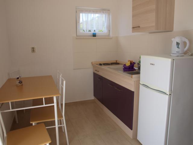 Studio pro 2 osoby, menší apartmán s manželským lůžkem, kuchyňský kout, koupelna/WC.