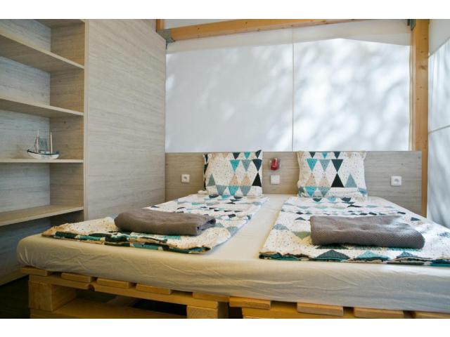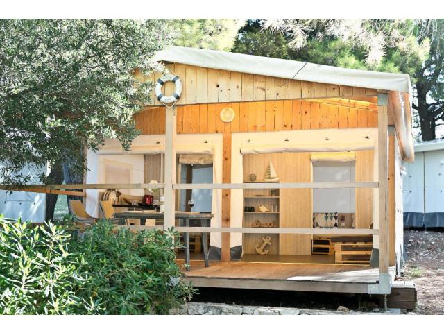 Mobilhome pro 4-6 osob - Mobilhome má vlastní sociální zařízení (sprchový kout, WC a umyvadlo), rozměry 8 x 3 m a uvnitř je rozdělen na 3 místnosti: 1. - ložnice s dvoulůžkem; 2. - denní prostor s kuchyňskou linkou (vybavenou potřebami pro stolování, rychlovarnou konvicí a mikrovlnnou troubou), jídelním koutem a velkou lednicí s odděleným mrazákem; 3. - dětský pokojík se dvěma lůžky a možností patrové přistýlky (určena pouze pro děti do 12 let); plus prostor se sociálním zařízením. Mobilhome má uvnitř dostatečně velký prostor pro stolování (vhodný zejména při nepříznivém počasí), úložné prostory pro oblečení a zavazadla. Před vchodem mobilhomu je umístěna prostorná zastřešená terasa s posezením.