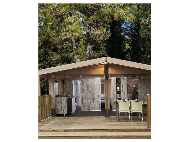 Mobile home Superior 5+1 - cca 34 m² - ložnice s manželskou postelí, ložnice se 2 samostatnými lůžky a 1 zavěšeným lůžkem pro 1 dítě do nedovršených 12 let, obývací pokoj s kuchyňským koutem, 2x sociální zařízení se sprchou, terasa