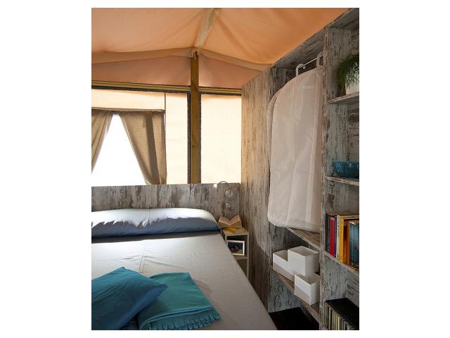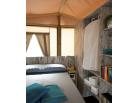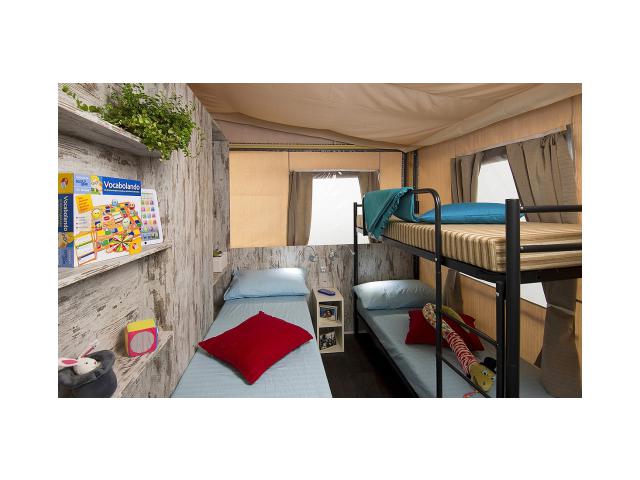 Safari Lodge 4+1 - cca 40 m² - 1 ložnice s manželskou postelí, 1 ložnice s 1 samostatným lůžkem pro dospělou osobu a palandou pro 1 dospělou osobu a dítě do nedovršených 12 let, obývací pokoj s kuchyňským koutem, sociální zařízení se sprchou, terasa